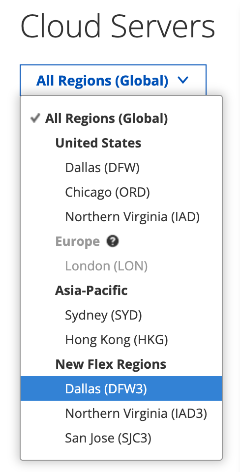 Rackspace Flex Cloud is currently available in the IAD (US-East), DFW (US-Central), and SJC (US-West) regions. You'll want to use the appropriate portal to ensure you're logging into the desired region: